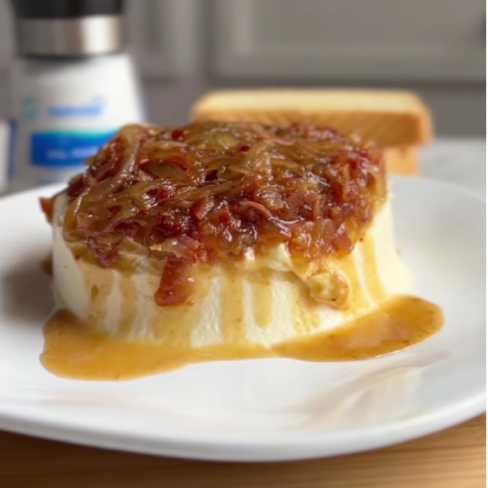 Monta el dip Coloca el queso crema en un plato o pocillo como base. Vierte encima la mezcla caliente de cebolla caramelizada y tocineta. Puedes decorar con un poco de perejil fresco picado si quieres un contraste verde.