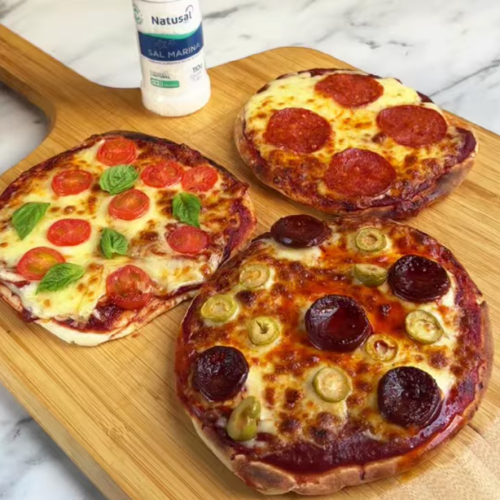 Estas minipizzas caseras destacan por su versatilidad y facilidad. La salsa casera aporta profundidad y carácter, mientras que los distintos toppings permiten jugar con combinaciones clásicas o más frescas. El toque final de Natusal Marina Grano Grueso, agregada justo al salir del horno, potencia el queso, los embutidos y los vegetales, logrando un resultado sabroso y bien balanceado en cada bocado.